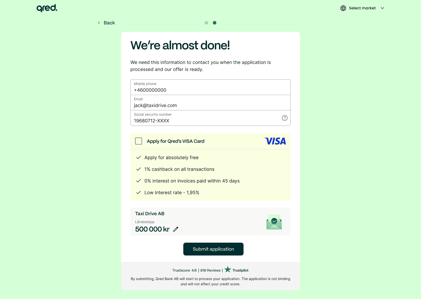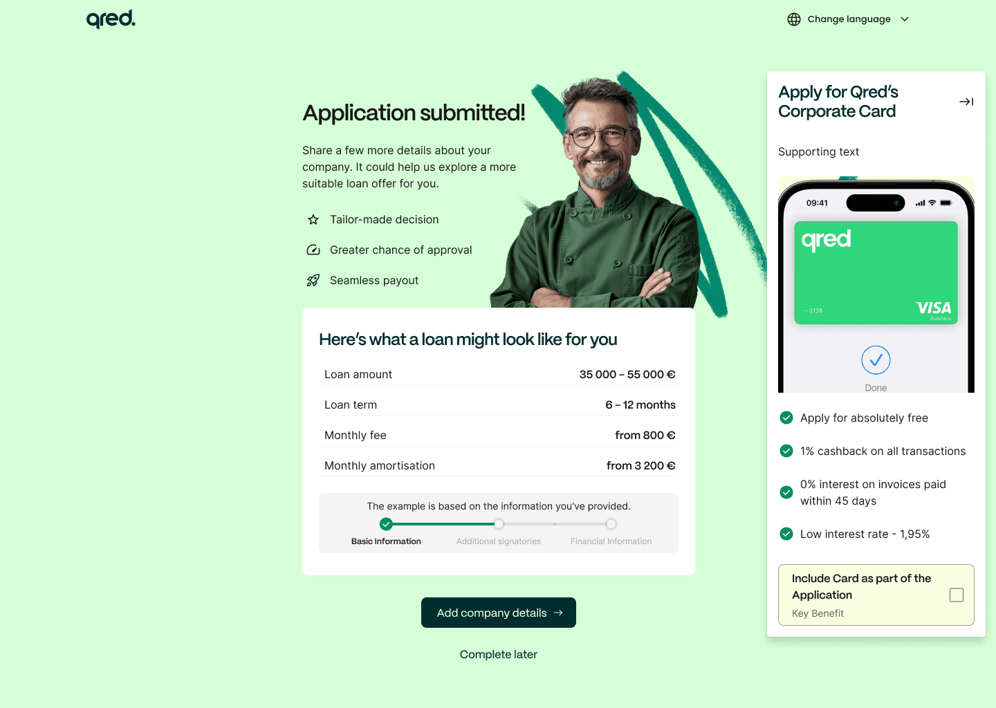 Qred Bank offers loans and cards in a quick and easy manner to MSMEs. Around 30,000 users across 7 EU countries enter the onboarding funnel every month.