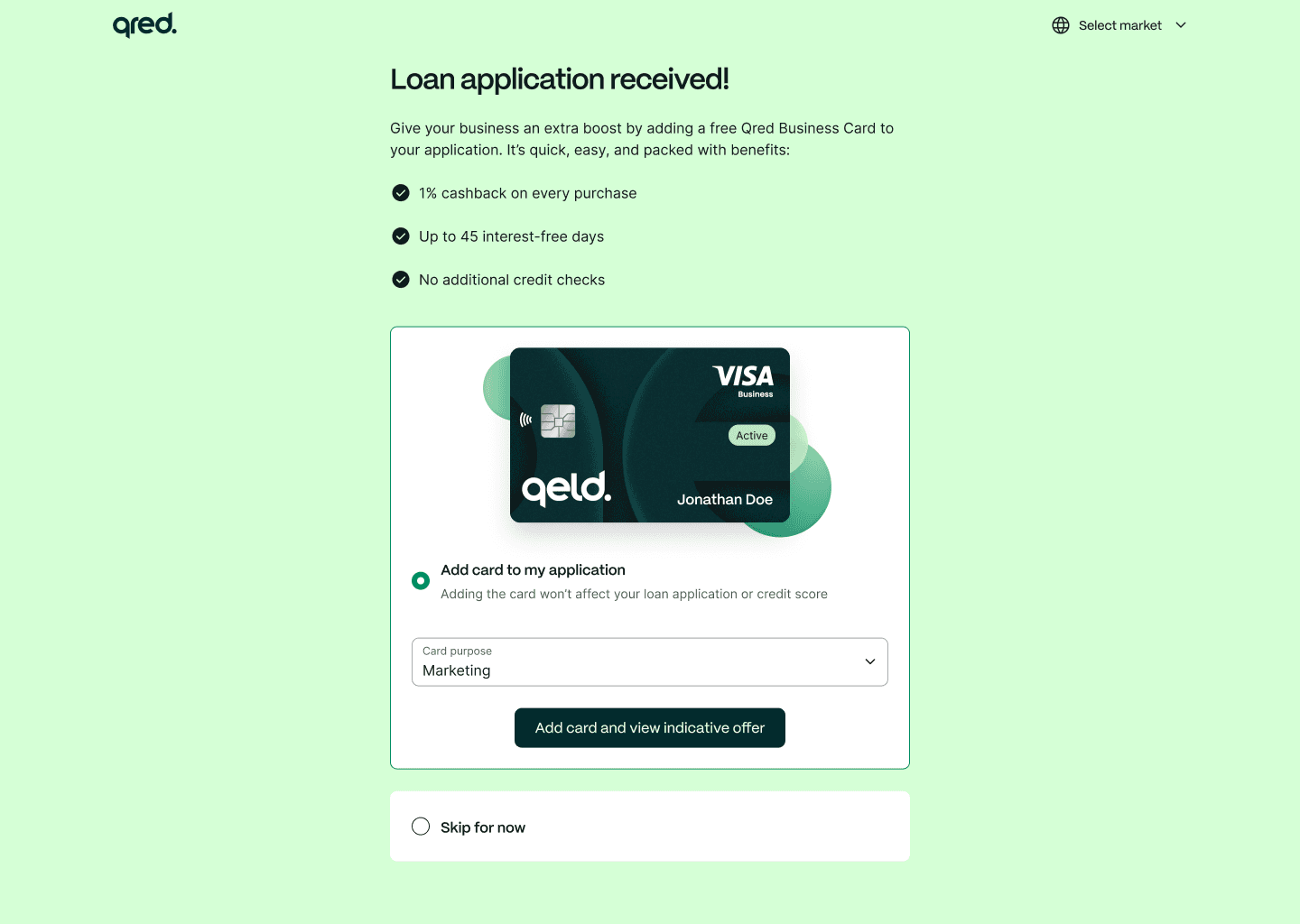 Increase revenue by scaling Qred’s credit card to applicants who are applying for a loan. The goal is to provide users seeking a business loan with the opportunity to apply for a card with the goal of at least a 10% opt-in for the cards.